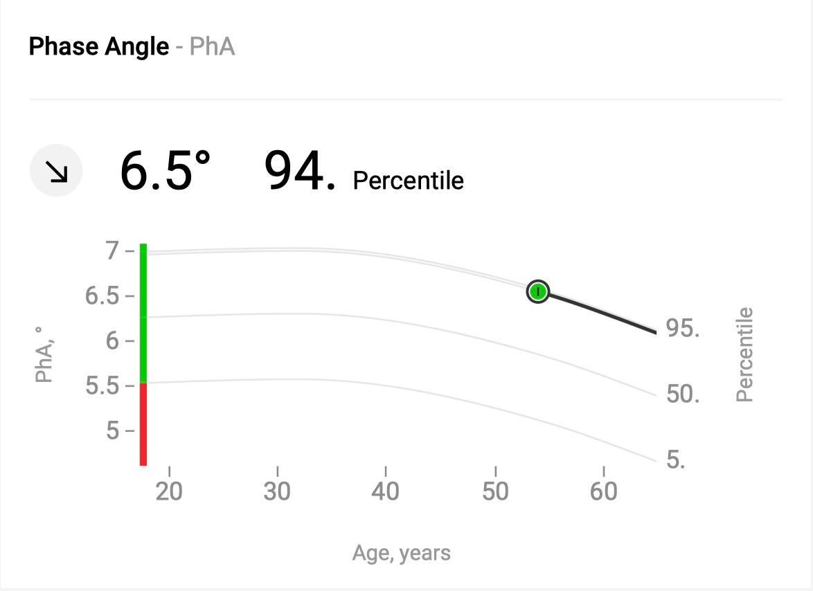 Phase Angle and water balance show how resilient your cells are — key indicators of vitality, recovery, and aging well. Higher values mean stronger cells and better long-term health.